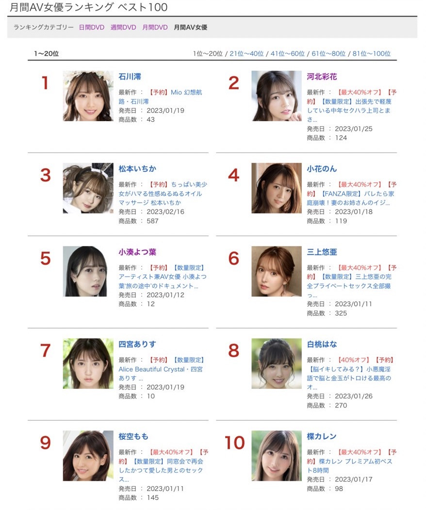 简单说就是小凑很卖,但还没有卖到横扫天下的程度。接下来就是石川澪的部分了:在上个月分析排行榜的时候我就已经说她是「天下第三人」,买气凶猛地喷发中,而在上个月除了所属片商Moodyz的新作「限界突破ポルチオ开発おま●こ激ピストン潮吹きアクメ」(5)外她还有写真作「Mio 幻想航路」上架接受预约(16),两支作品卖得都很好,再加上占了打折的便宜,于是就登上冠军宝座了〜